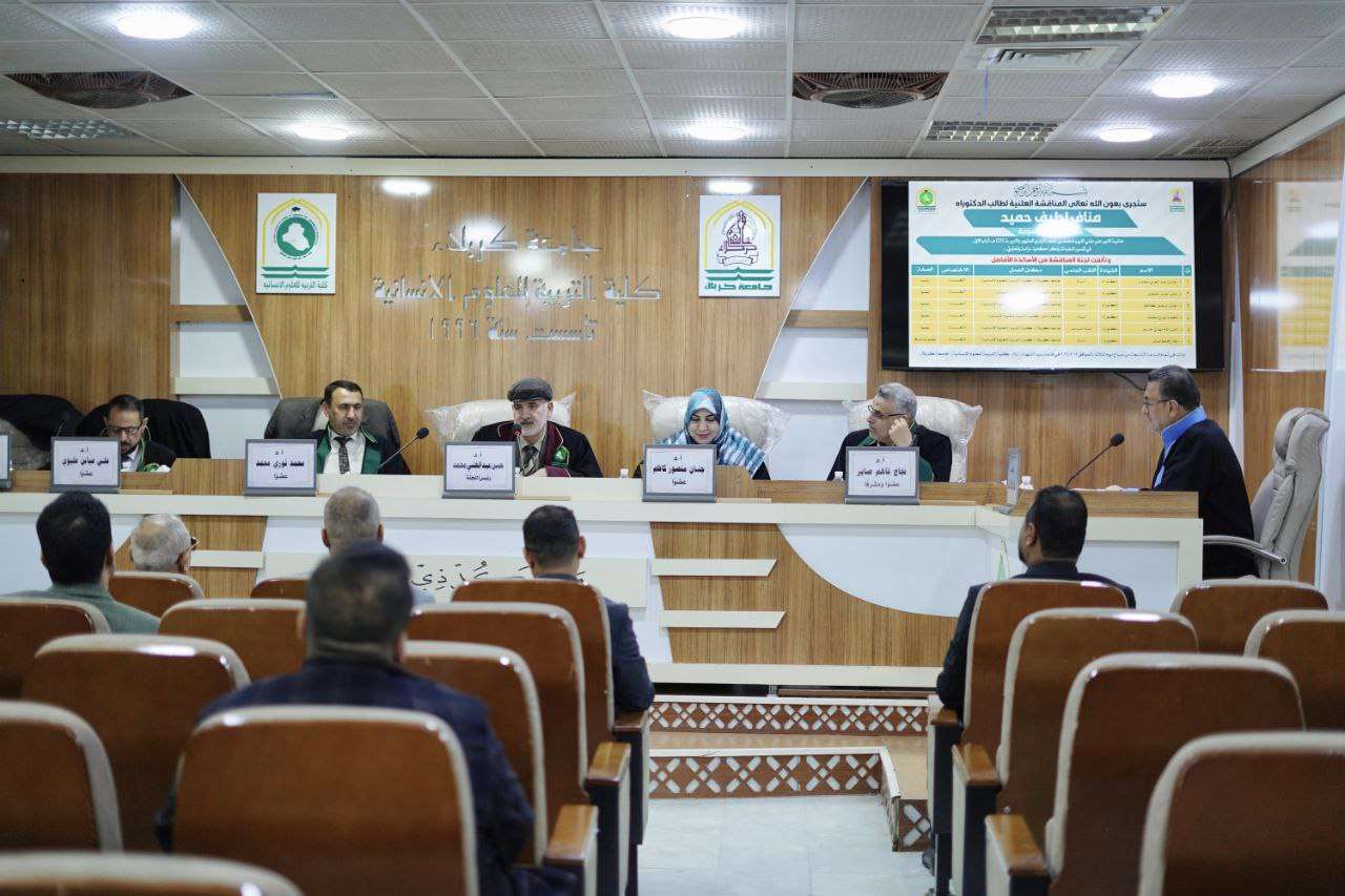 ناقشت أطروحة دكتوراه في كلية التربية للعلوم الإنسانية بجامعة كربلاء “حاشية الأمير على مغني اللبيب لمحمد بن محمد الأزهري المشهور بالأمير (ت 1232هـ) – الباب الأول: في تفسير المفردات وذكر أحكامها – دراسةٌ وتحقيقٌ”، للطالب مناف لطيف حميد