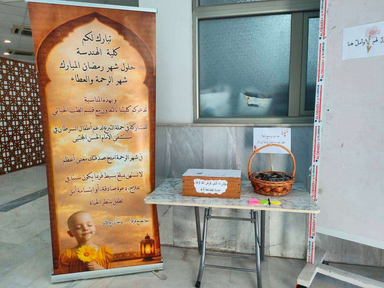 تدعو كلية الهندسة وبالتعاون مع قسم هندسة الطب الحياتي جميع الطلبة والتدريسيين والمنتسبين إلى المشاركة في حملة التبرع لدعم أطفال السرطان في مستشفى الإمام الحسن المجتبى وذلك تزامنًا مع حلول شهر رمضان المبارك، شهر الرحمة والعطاء.