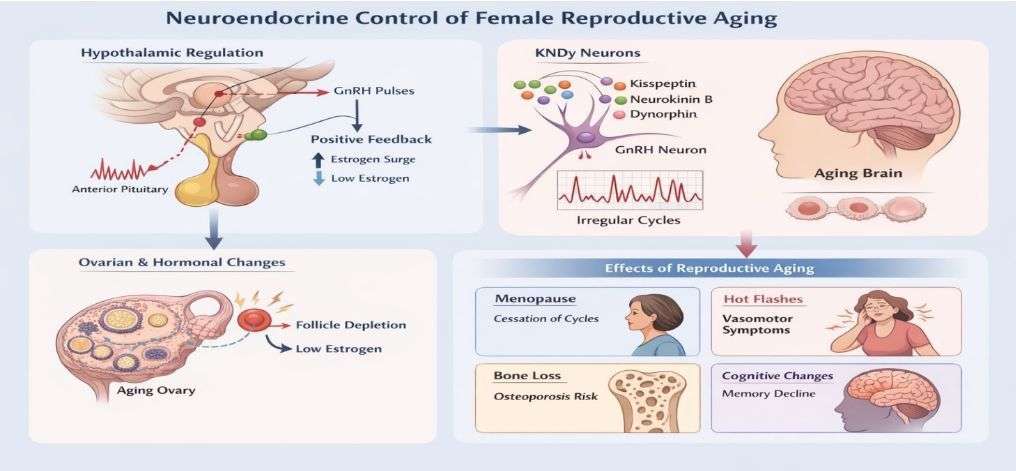 لا تقتصر شيخوخة الجهاز التناسلي الأنثوي على المبيض فقط، بل هي مرحلة انتقالية عصبية صماء تتضمن إعادة تنظيم ديناميكية لشبكات منطقة ما تحت المهاد، وتغير نبضات هرمون GnRH، وتعديل التغذية الراجعة الستيرويدية، وعمليات الشيخوخة العامة. تتكيف الدوائر التنظيمية المركزية استجابةً للشيخوخة وانخفاض الإشارات المحيطية، مما يساهم في التغيرات الهرمونية والفسيولوجية المميزة لانقطاع الطمث.