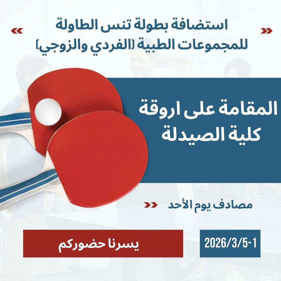 تعلن كلية الصيدلة في جامعة كربلاء عن استضافة بطولة تنس الطاولة للمجموعة الطبية (الفردي و الزوجي)