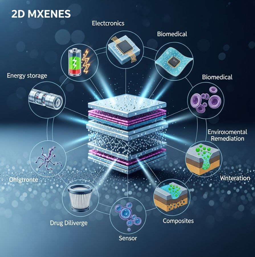 نتيجة لذلك، أظهرت MXenes إمكانات تحويلية في طيف واسع من التطبيقات. في مجال تخزين الطاقة، تُستخدم هذه المواد كأقطاب كهربائية عالية الأداء للمكثفات الفائقة وبطاريات الجيل القادم، إذ توفر نقلًا سريعًا للأيونات وسعة حجمية عالية. وتُعدّ قدرتها على حجب التداخل الكهرومغناطيسي من بين أعلى القدرات المُسجلة لمواد الأغشية الرقيقة. علاوة على ذلك، تُجرى أبحاث مكثفة على مواد MXenes في مجالات المعالجة البيئية (تنقية المياه وامتصاص المعادن الثقيلة)، والهندسة الطبية الحيوية (الاستشعار الحيوي، والعلاج الضوئي الحراري للسرطان، وتوصيل الأدوية)، والإلكترونيات المرنة. يُسلط هذا الملخص الضوء على علاقات التركيب والخواص التي تجعل من MXenes بديلاً متفوقًا للمواد النانوية ثنائية الأبعاد التقليدية، مثل الجرافين، في الأنظمة متعددة الوظائف.