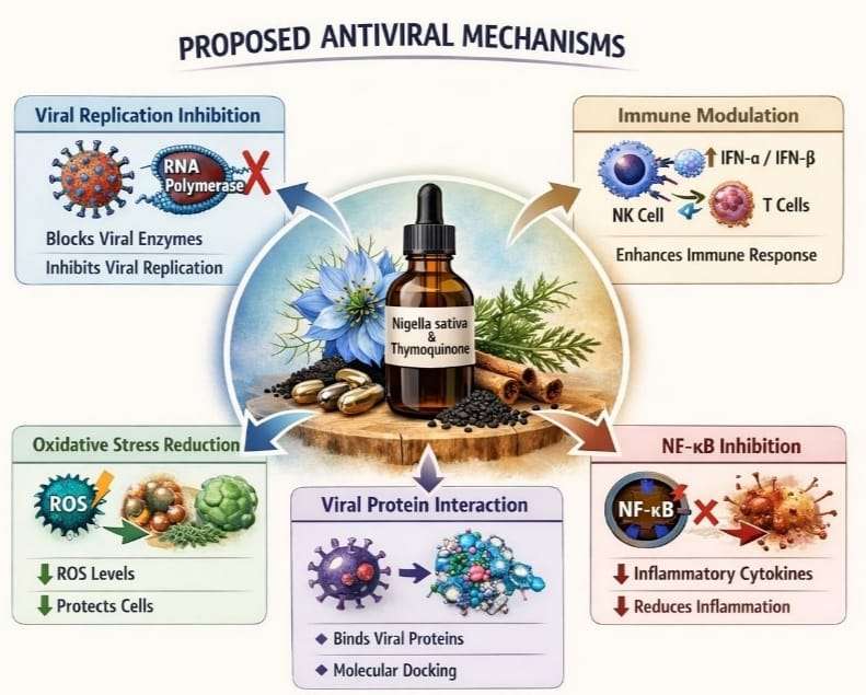 التأثير المضاد للفيروسات لزيت الحبة السوداء يعتمد أساسًا على إعادة برمجة الاستجابة المناعية للمضيف وليس على تثبيط الفيروس بشكل مباشر.