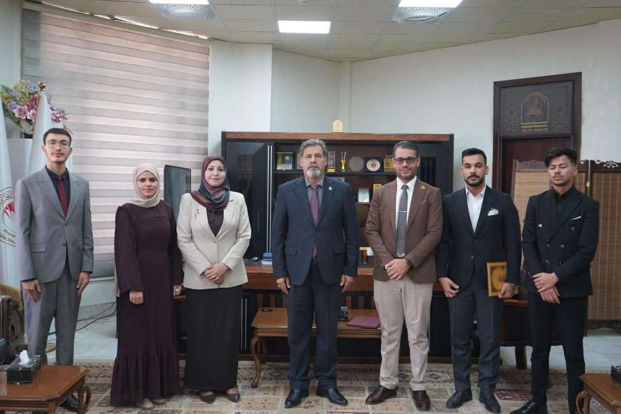 University President Professor Sabah Wajid honored the university’s debating team after their outstanding achievement of qualifying for the quarterfinals in the second stage of the World University Debating Championships, organized by the International Academy for Leadership and Development in cooperation with the Ministry of Higher Education and Scientific Research.
